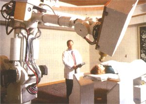 2.该系统设有一个三维机械臂,并把加速器依附在机械臂上。通过计算机(UNIX工作台)运算,采用图像引导技术获取的低剂量三维放射图像,由CT扫描来追踪肿瘤位置,然后再以正确剂量的放射线来切除肿瘤。此技术的准确率非常高,误差可小于毫米。这种技术称为CMSR(Computer Medicated Stereotactic Radiosurgery)。